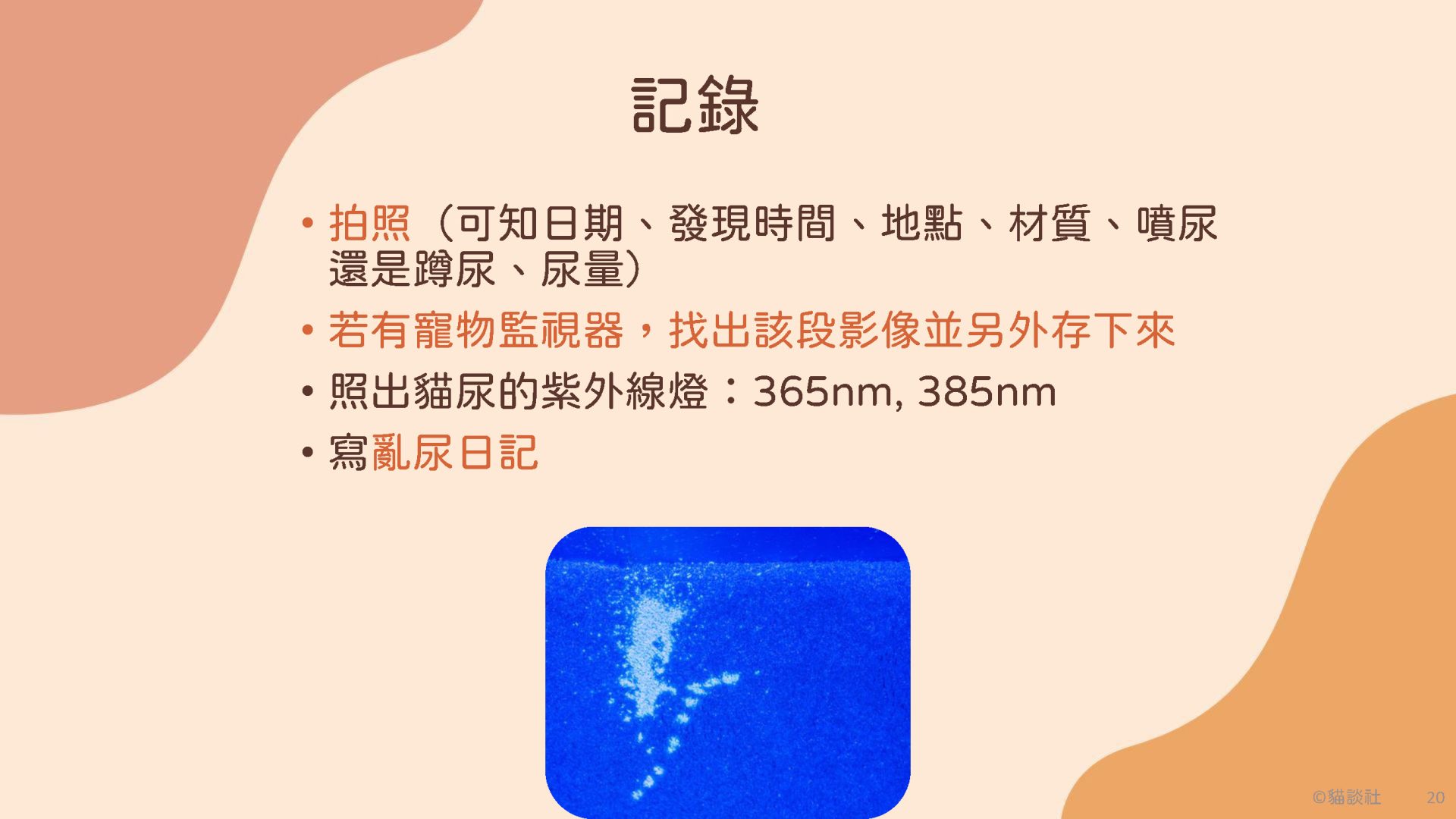 此外還可以用紫外線照燈搜尋,有沒有遺漏的亂尿地點 — 尤其是少量噴尿,肉眼常常完全看不出來。