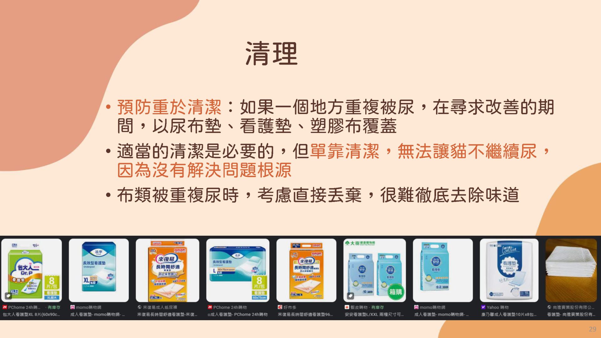 ⚠️ 避免使用香味濃厚的清潔用品去覆蓋尿味,這有可能會刺激貓咪再次進行標記🛡️ 預防:尋求改善的期間,對於反覆被尿的地點,可先以塑膠布或看護墊覆蓋