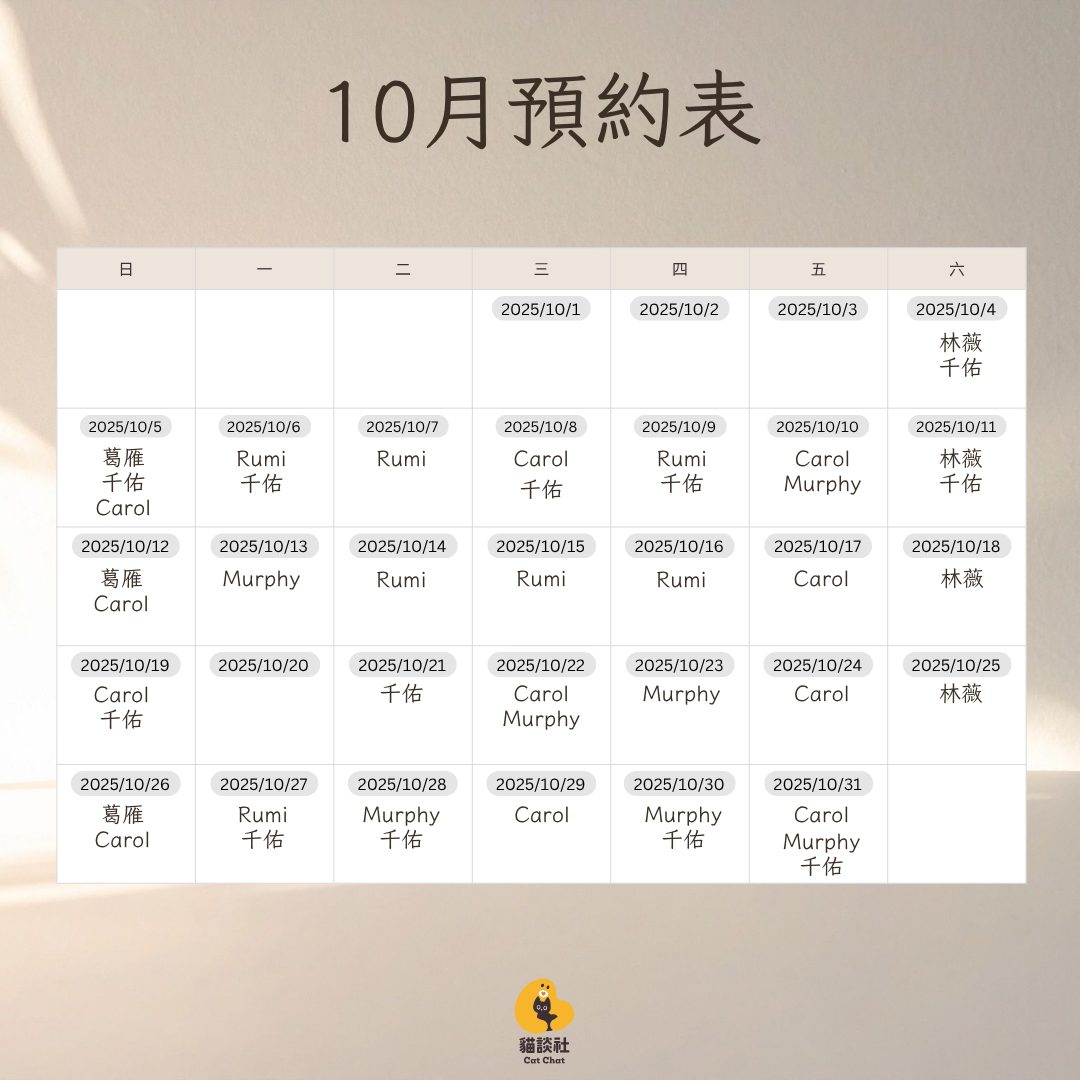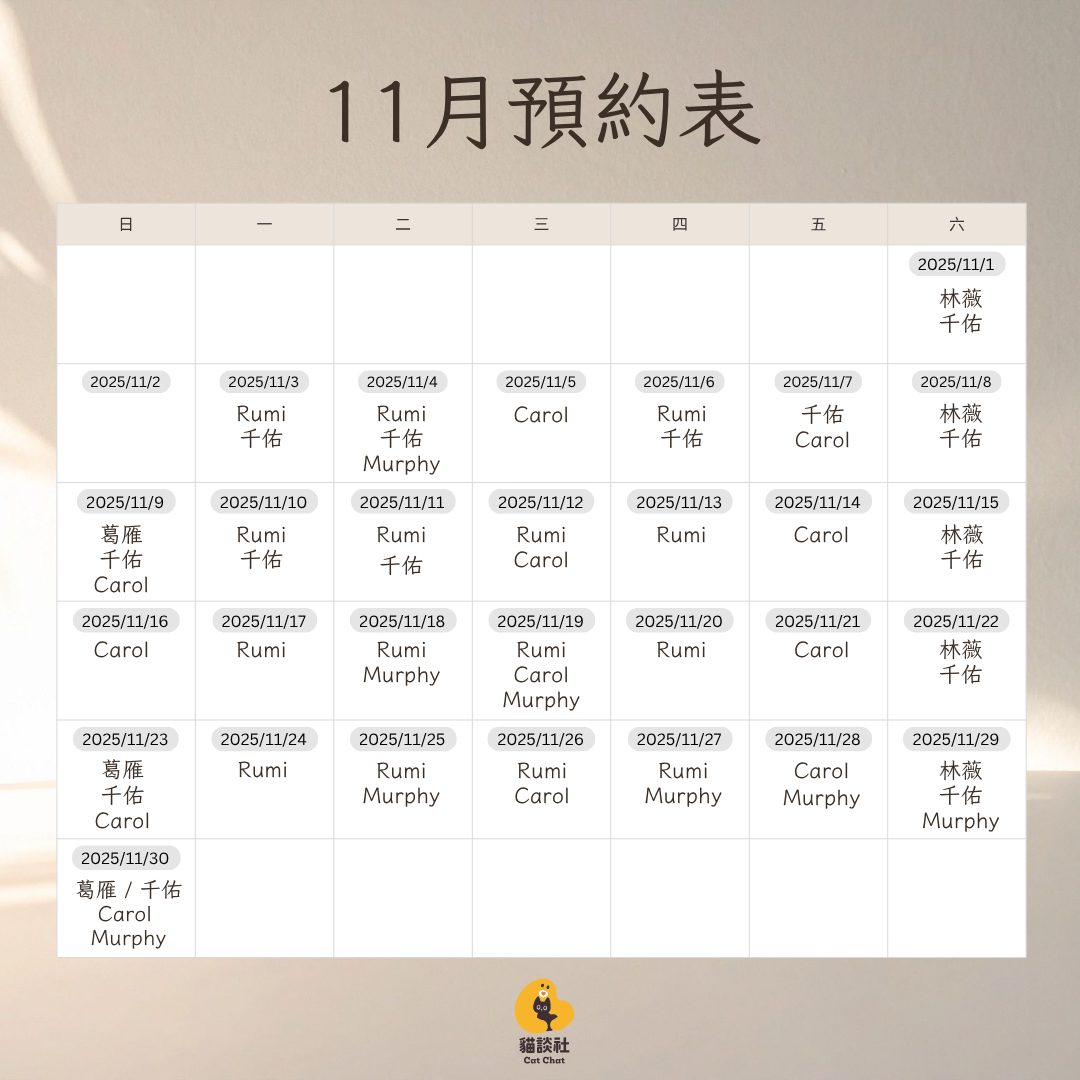 預約諮詢 Step 0閱讀預約須知 Step 1選擇諮詢方式 Step 2選擇諮詢師 Step 3選時間付款 視訊諮詢:選擇諮詢師 費率因資歷多寡而異,請選擇符合您時間和預算的諮詢師預約 葛雁 諮詢師資歷:6 年,貓談社創辦人 視訊諮詢:NTD $5,500/小時 服務時間:週日 預約:Now - 12 月已開放預約,急迫個案插隊可私訊詢問 確認選擇 賴鏡如 Rumi 加入貓談社:3 年 視訊諮詢:NTD $3,500/小時 服務時間:週一晚;二、三、四下午 預約:Now - 12 月已開放預約,急迫個案插隊可私訊詢問 確認選擇 林芷薇(林薇) 加入貓談社:2 年 視訊諮詢:NTD $3,000/小時 服務時間:週六 預約:11 月開放預約 確認選擇 王敬雯 Carol 加入貓談社:1 年 視訊諮詢:NTD $2,500/小時 服務時間:週三、五、日 預約:Now - 11 月開放預約 確認選擇 温千佑(千佑) 諮詢師資歷:1 年 視訊諮詢:NTD $2,500/小時 服務時間:不固定日期 預約:Now - 11 月開放預約 確認選擇 蕭博勻 Murphy 諮詢師資歷:1 年 視訊諮詢:NTD $2,500/小時 服務時間:不固定日期 預約:Now - 11 月開放預約 確認選擇
