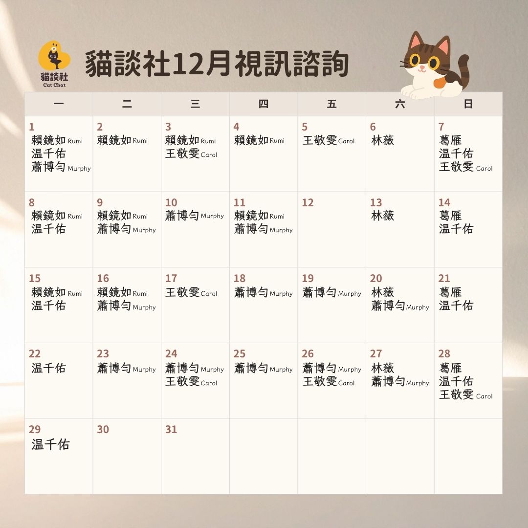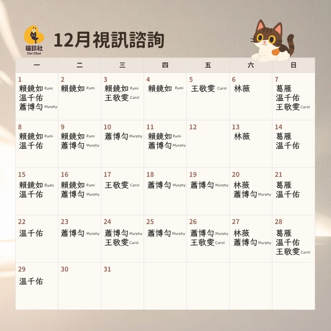 預約諮詢 Step 0閱讀預約須知 Step 1選擇諮詢方式 Step 2選擇諮詢師 Step 3選時間付款 視訊諮詢:選擇諮詢師 費率因資歷多寡而異,請選擇符合您時間和預算的諮詢師預約 葛雁 諮詢師資歷:6 年,貓談社創辦人 視訊諮詢:NTD $5,500/小時 服務時間:週日 預約:Now - 12 月已開放預約,急迫個案插隊可私訊詢問 確認選擇 賴鏡如 Rumi 加入貓談社:3 年 視訊諮詢:NTD $3,500/小時 服務時間:週一晚;二、三、四下午 預約:Now - 1 月已開放預約,急迫個案插隊可私訊詢問 確認選擇 林芷薇(林薇) 加入貓談社:2 年 視訊諮詢:NTD $3,000/小時 服務時間:週六 預約:12 月已滿 確認選擇 王敬雯 Carol 加入貓談社:1 年 視訊諮詢:NTD $2,500/小時 服務時間:週三、五、日 預約:Now - 12 月開放預約 確認選擇 温千佑(千佑) 諮詢師資歷:1 年 視訊諮詢:NTD $2,500/小時 服務時間:不固定日期 預約:Now - 12 月開放預約 確認選擇 蕭博勻 Murphy 諮詢師資歷:1 年 視訊諮詢:NTD $2,500/小時 服務時間:不固定日期 預約:Now - 12 月開放預約 確認選擇