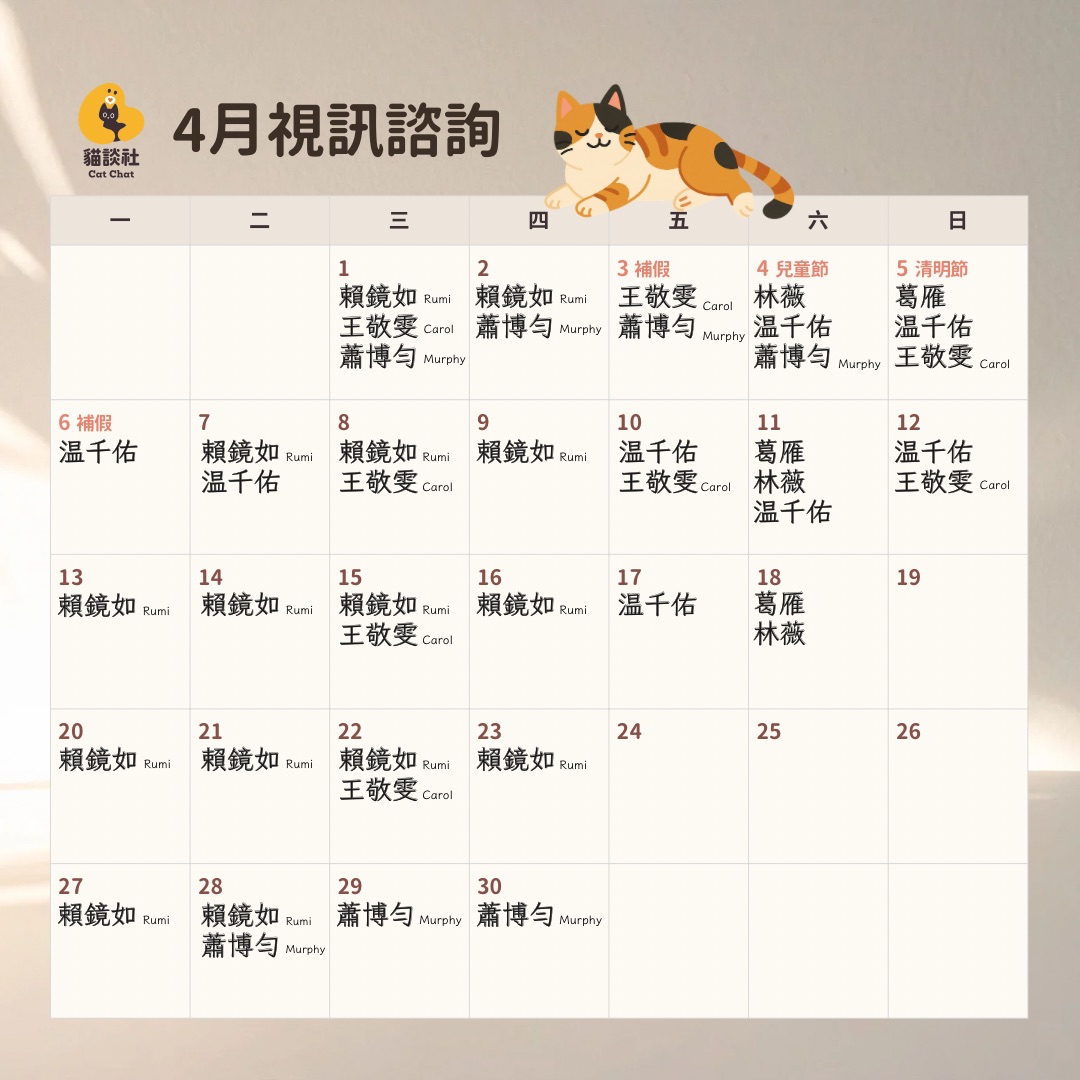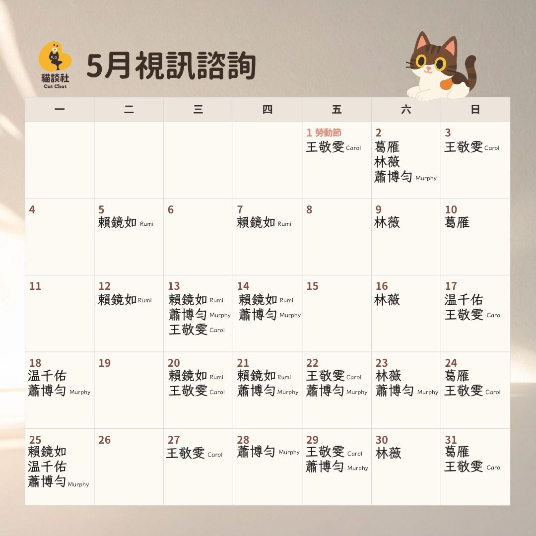 預約諮詢 Step 0閱讀預約須知 Step 1選擇諮詢方式 Step 2選擇諮詢師 Step 3選時間付款 視訊諮詢:選擇諮詢師 費率因資歷多寡而異,請選擇符合您時間和預算的諮詢師預約 *貓疑似心因性過度理毛、自發性膀胱炎、分離焦慮?請由獸醫診斷,再由我們協助行為減壓唷 葛雁 諮詢師資歷 6 年,貓談社創辦人 NTD $6,000/小時 急迫個案插隊,可私訊詢問 # 飼主 / 同住家人瀕臨崩潰 # 困難個案 # 二手個案 # 第二意見 預約「視訊」 賴鏡如 Rumi 加入貓談社 4 年 NTD $4,000/小時 急迫個案插隊,可私訊詢問 # 幼貓放電 # 敏感貓 # 多貓衝突 # 隔離介紹 # 自發性膀胱炎減壓 # 分離焦慮減壓 預約「視訊」 林芷薇(林薇) 加入貓談社 3 年 NTD $3,500/小時 # 困難親訓 # 跨國搬家 # 攻擊 # 隔離介紹 # 遛貓 # 環境豐富化 # 分離焦慮傾向減壓 預約「視訊」 王敬雯 Carol 加入貓談社 1.5 年 NTD $3,000/小時 # 攻擊 # 嚎叫 # 飲食 # 心因性過度理毛減壓 # 自發性膀胱炎減壓 # 高電量貓 # 環境豐富化 預約「視訊」 温千佑(千佑) 加入貓談社 1.5 年 NTD $3,000/小時 # 攻擊 # 親訓 # 嚎叫 # 減壓 # 日常照護訓練 # 響片 # 環境豐富化 預約「視訊」 蕭博勻 Murphy 諮詢師資歷 1.5 年 NTD $3,000/小時 急迫個案插隊,可私訊詢問 # 貓間磨合 # 亂尿亂便 # 攻擊 # 遛貓 # 響片 # 貓宅規劃 # 膽小貓減壓 預約「視訊」